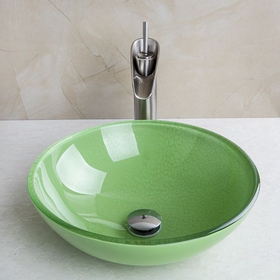 De kraan is geborsteld nikkel afgewerkt en past mooi bij de glazen hand geschilderde groene waskom.